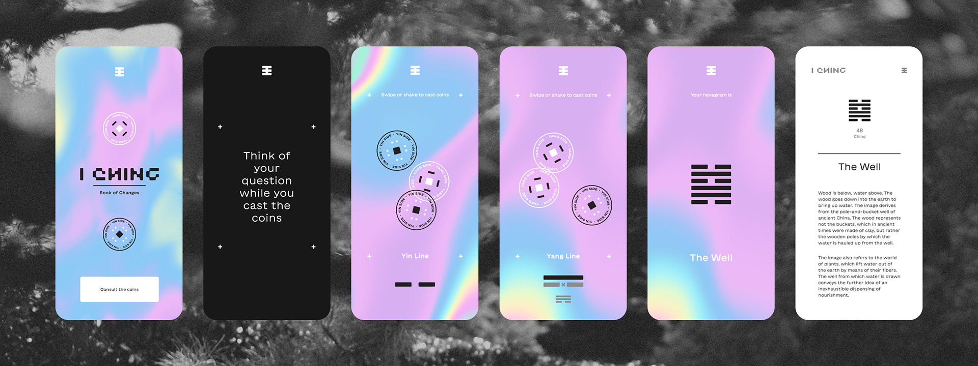 The I Ching is an ancient Chinese divination system. Its modern use promotes self-reflection, discovery and meditation - somewhat similar to astrology and the tarot. My personal philosophy is that these types of frameworks are useful for presenting a question, and starting a conversation - not that they ought to predict the future or tell the querent what to do. The app would be positioned as a tool supporting mental health.